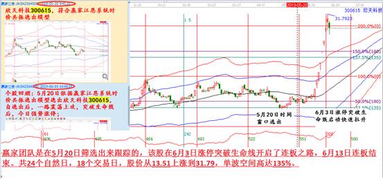 5月20日市場處于時(shí)間點(diǎn)附近,股價(jià)站穩(wěn)江恩180度位置13.73,從而以時(shí)價(jià)關(guān)系模型選出,但是當(dāng)時(shí)市場處于生命線下,并未直接啟動(dòng)。而是在6月3日一舉漲停突破,開啟加速之路。我們按照江恩趨勢,價(jià)格和時(shí)間周期的方法是可以把握到該股后期的強(qiáng)勢拉升的。贏家用戶在6月5日突破藍(lán)色線后介入,并在6月12日退出,盈利巨大。