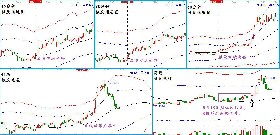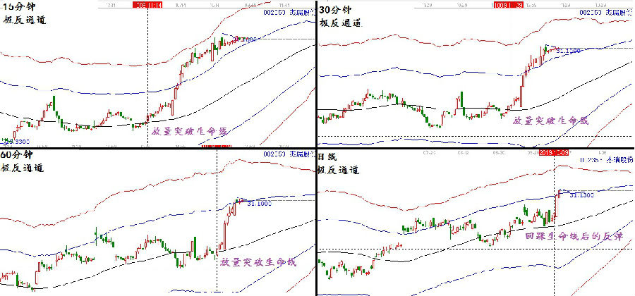 趨勢(shì)共振模型一類:以極反通道生命線為判斷依據(jù),生命線是判斷市場(chǎng)趨勢(shì)強(qiáng)弱的分界線,可以快速直觀的判斷出市場(chǎng)短期,中期,及長期的趨勢(shì)強(qiáng)弱,如果各周期都是處于強(qiáng)勢(shì)區(qū),這就是一種共振。因此,在實(shí)戰(zhàn)交易中,投資者關(guān)注周線,日線,60分鐘,30分鐘,及15分鐘,如果這幾個(gè)周期都是處于生命線附近,走勢(shì)協(xié)同,就會(huì)出現(xiàn)短期的快速拉升走勢(shì)。