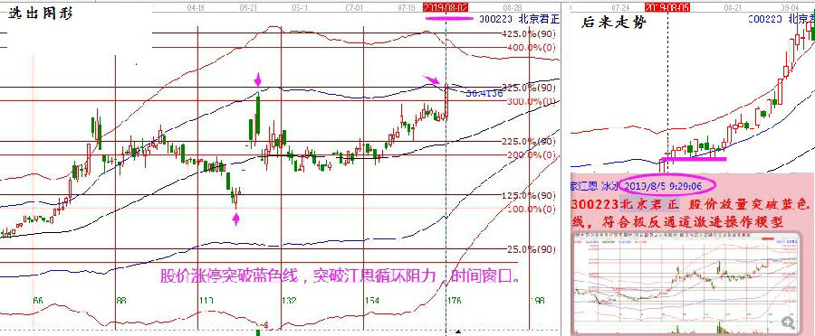 下圖是北京君正之前的一個激進買點,現在做個回顧。8月2日是江恩時間窗口,當天股價放量漲停突破藍色線,江恩循環(huán)阻力點,構成了激進買點,隨后市場震蕩不破藍色線,維持藍色線與紅色線區(qū)間內的趨勢上攻走勢。