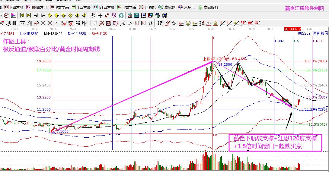 下圖是恒邦股份的超跌買點展示:股價調整到極反通道藍色下軌線,同時,江恩120度分割位支撐附近,疊加1.5倍時間窗口,短期共振向上,符合極反通道藍色下軌線超跌買點要求。短期從藍色下軌線反彈超10%,時間窗口11月12日為階段低點。按照規(guī)則買入,反彈目標就是生命線。