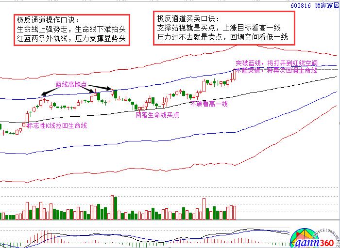 操作口訣:生命線上強勢走,生命線下難抬頭,紅藍兩條外軌線,壓力支撐顯勢頭。生命線是趨勢強弱的分界線和重要的支撐阻力線。