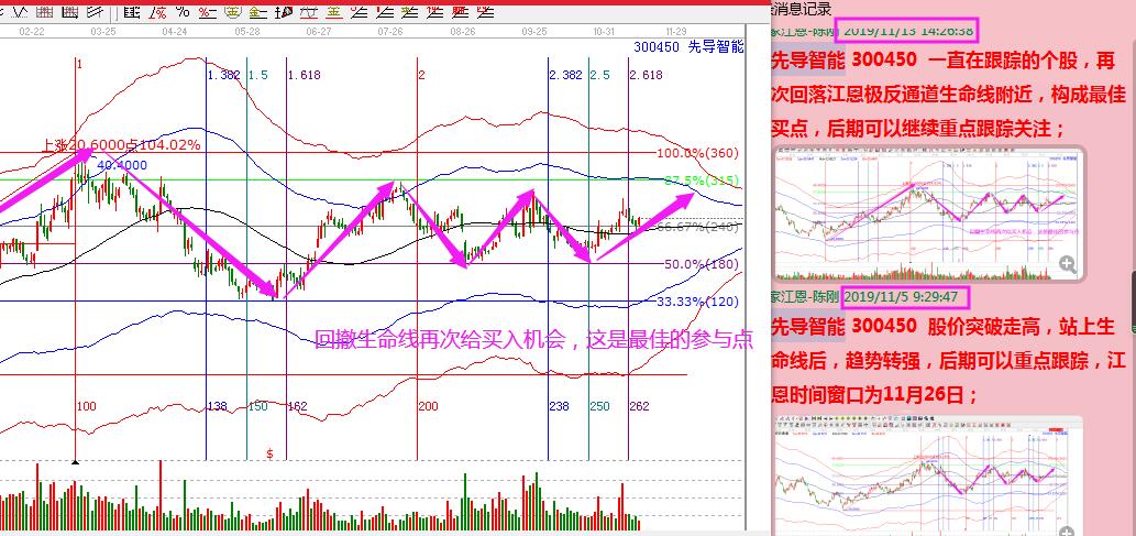 下圖是先導智能生命線的穩(wěn)健買點展示,10月28日股價放量突破生命線,隨后震蕩跌破,股價一直縮量生命線附近運行,11月5日是站穩(wěn)生命線的第三個交易日,首次開始關注,11月13日股價在經過拉升之后回撤至江恩240度支撐點,與生命線支撐點很近,價格上形成共振走勢,同時股價處于明確的上漲周期中,故,趨勢,價格,時間符合極反通道穩(wěn)健買點要求,按照規(guī)則買入,持股目標就是藍色線。