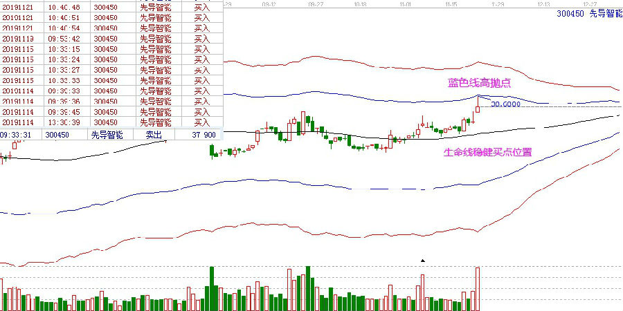 先導智能生命線啟動之后,11月22日攻擊到了目標點藍色線,這是我們生命線穩(wěn)健買點的目標點,按照規(guī)則可以獲利賣出。下面是具體的走勢圖: