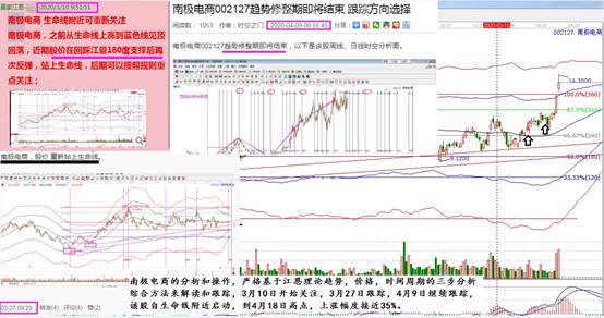 南極電商(002127):3月10日開(kāi)始關(guān)注,3月27日跟蹤,4月9日跟蹤,該股自生命線附近啟動(dòng),到4月18日高點(diǎn),上漲幅度35%。下圖是跟蹤記錄和具體的分析。
