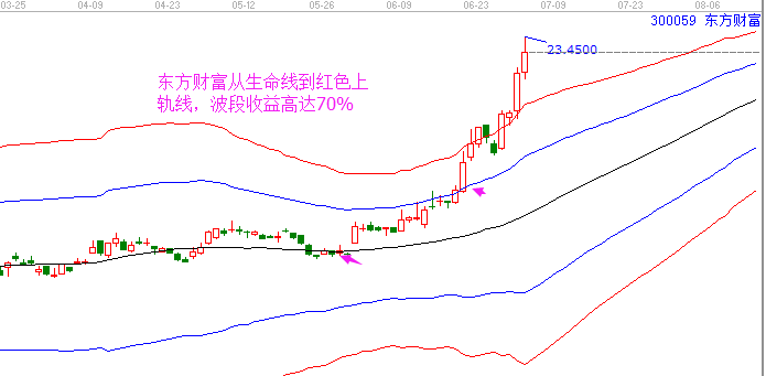 2、東方財(cái)富,從生命線到紅色超強(qiáng)勢(shì)外軌線,波段收益高達(dá)70%