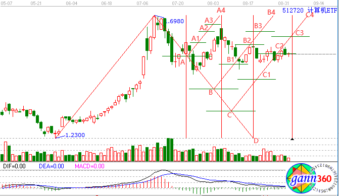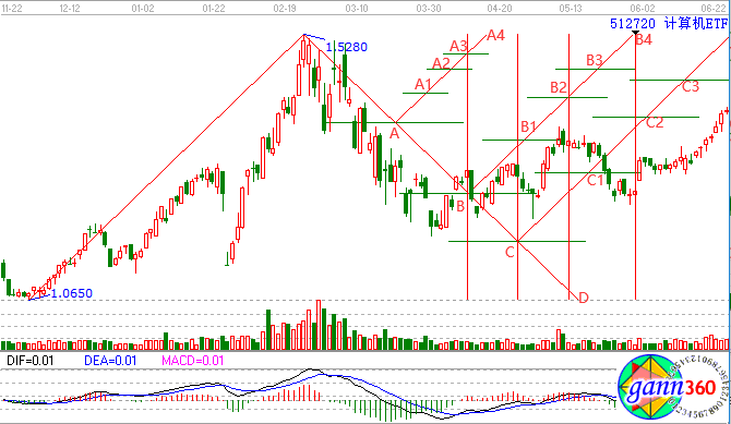 圖中A點所對應的時間窗口是短期一波上漲的結(jié)束,之后便是下跌,A4點和D點所對應的時間窗口同樣也是上漲的結(jié)束,之后出現(xiàn)下跌。那么計算機ETF接下來怎么走呢?