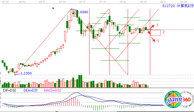 因為研究的時間周期跨度為半年多,因此結(jié)果上也會有著1~2天的小誤差,想要更加精準的分析,就需要研究更小的時間周期跨度了。而通過上圖我們可以看到,K線會沿著紅色斜線的方向來運行,而在趨勢轉(zhuǎn)折點的位置往往會發(fā)生走勢的變化,同時會在綠色橫線的位置獲得支撐或者壓力。那么計算機ETF接下來為怎么走呢?下面我們就用這個工具對計算機ETF未來的走勢進行分析預測。