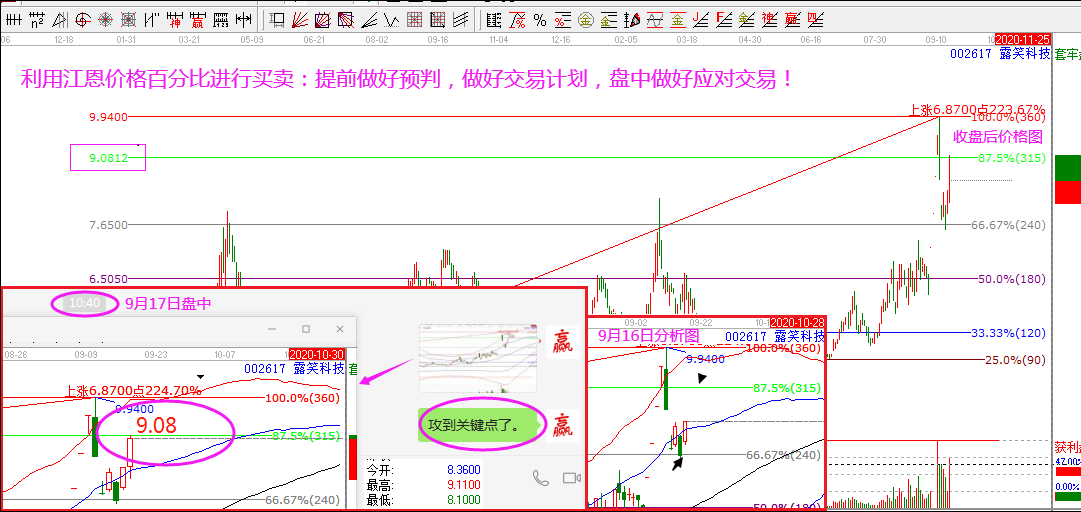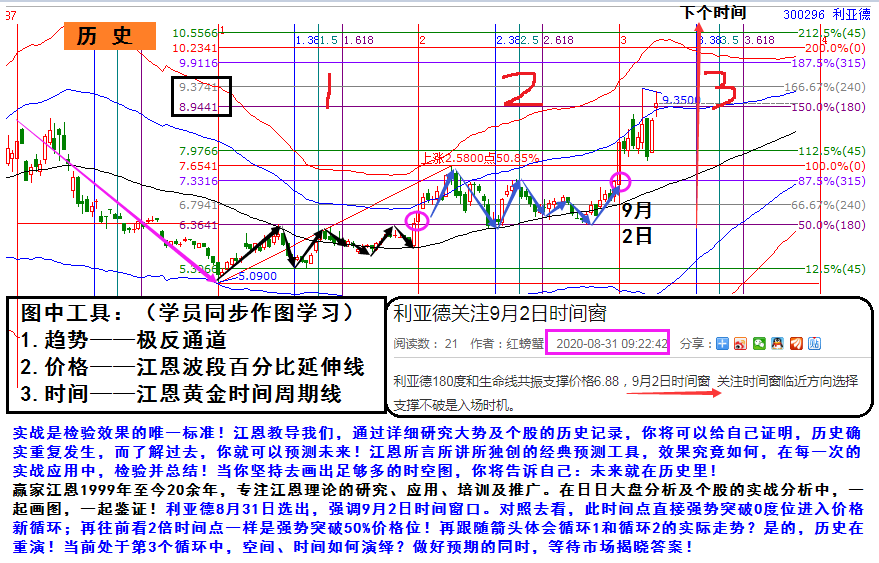 贏家江恩1999年至今20余年,專注江恩理論的研究、應(yīng)用、培訓(xùn)及推廣。在日日大盤分析及個股的實戰(zhàn)分析中,一起畫圖,一起鑒證!利亞德8月31日選出,強(qiáng)調(diào)9月2日時間窗口。對照去看,此時間點(diǎn)直接強(qiáng)勢突破0度位進(jìn)入價格新循環(huán);再往前看2倍時間點(diǎn)一樣是強(qiáng)勢突破50%價格位!再跟隨箭頭體會循環(huán)1和循環(huán)2的實際走勢?是的,歷史在重演!當(dāng)前處于第3個循環(huán)中,空間、時間如何演繹?做好預(yù)期的同時,等待市場揭曉答案!