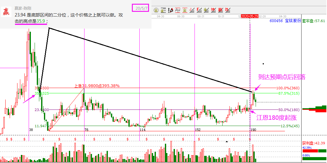 股票操作到最后其實就是買和賣的問題,因此買賣點(diǎn)的確定,甚至比選股更重要,因為任何股票,有波動就有套利空間。但是,對于價格的分析,大部分投資者依舊停留在看均線指標(biāo)這種簡單的跟隨上,依據(jù)這個想要判斷出好的買點(diǎn)和賣點(diǎn)難度太大。江恩理論是一套技術(shù)分析體系,其核心之一就是價格空間分析,借助江恩工具可以快速的判斷出市場的波動空間以及當(dāng)下的支撐阻力點(diǎn),而在確定了支撐-買點(diǎn)的位置,也同時確定了阻力的賣出位置,以及不及預(yù)期的止損點(diǎn)。這就是提前對市場價格走勢作出預(yù)判的過程。寶鈦股份5月初的分析,按照江恩操作規(guī)則,一線站穩(wěn)看高一線,股價在時間窗口突破站上180度23.94之后,價格目標(biāo)點(diǎn)看高一線到315度35.9。