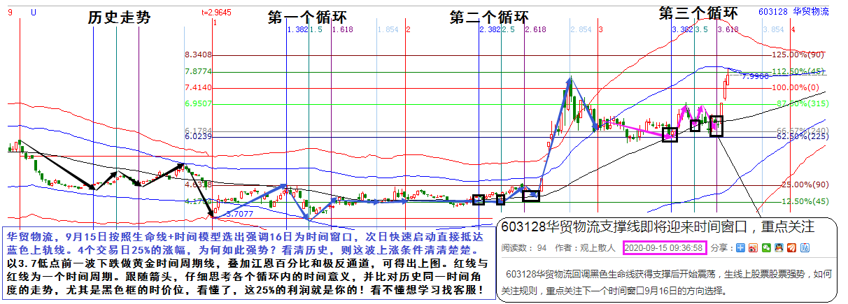 華貿(mào)物流,9月15日按照生命線+時(shí)間模型選出強(qiáng)調(diào)16日為時(shí)間窗口,次日快速啟動直接抵達(dá)藍(lán)色上軌線。4個(gè)交易日25%的漲幅,為何如此強(qiáng)勢?看清歷史,則這波上漲條件清清楚楚。