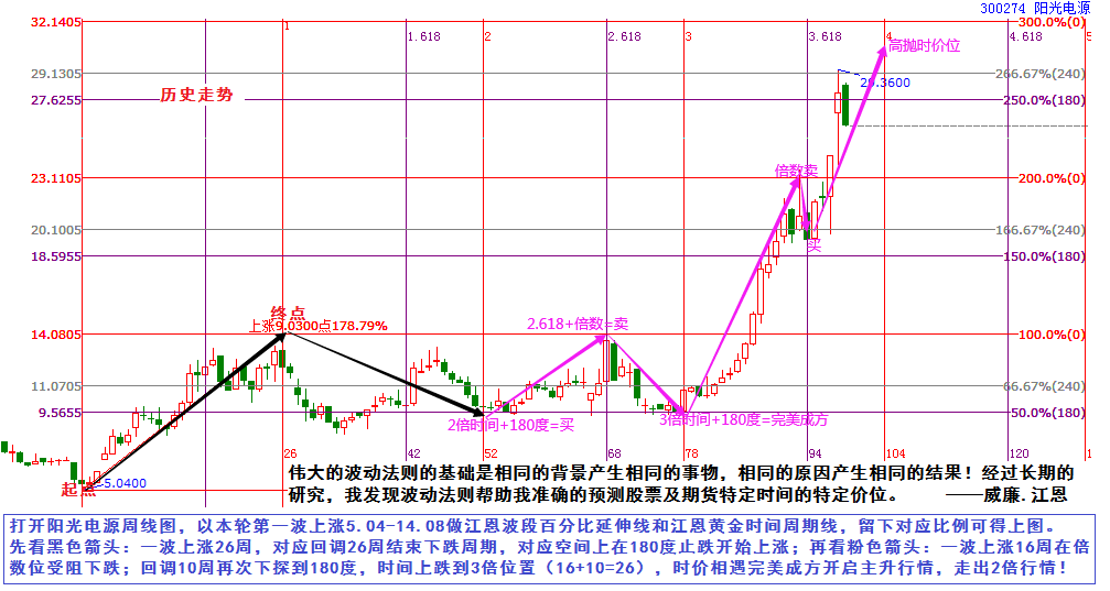 打開陽光電源周線圖,以本輪第一波上漲5.04-14.08做江恩波段百分比延伸線和江恩黃金時(shí)間周期線,留下對應(yīng)比例可得上圖。先看黑色箭頭:一波上漲26周,對應(yīng)回調(diào)26周結(jié)束下跌周期,對應(yīng)空間上在180度止跌開始上漲;再看粉色箭頭:一波上漲16周在倍數(shù)位受阻下跌;回調(diào)10周再次下探到180度,時(shí)間上跌到3倍位置(16+10=26),時(shí)價(jià)相遇完美成方開啟主升行情,走出2倍行情!