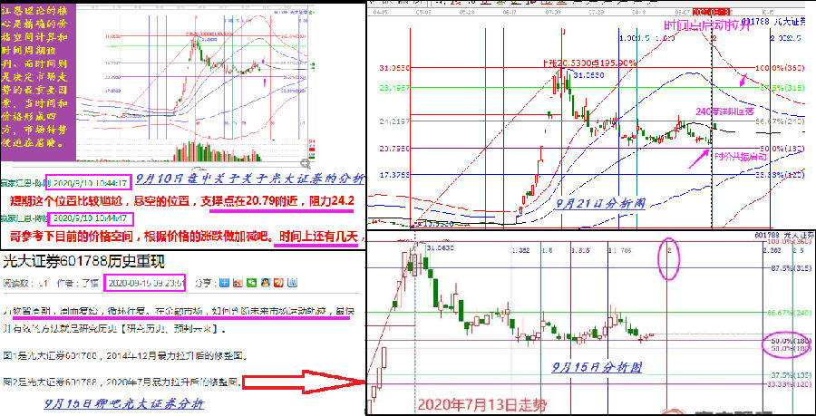 光大證券,股價(jià)長期在江恩240度與180度區(qū)間震蕩盤整,遲遲未能啟動就是因?yàn)闀r(shí)間不到,而,9月18日時(shí)間窗口到達(dá)后,與價(jià)格180度支撐形成共振,股價(jià)放量上攻。今天遇阻24.21附近,與今天高點(diǎn)只有0.03之差。價(jià)格相當(dāng)精準(zhǔn)。時(shí)間窗口的分析,可以幫助投資者規(guī)避下跌風(fēng)險(xiǎn),確定變盤窗口,起爆點(diǎn)買賣可以很大提高資金的使用效率。