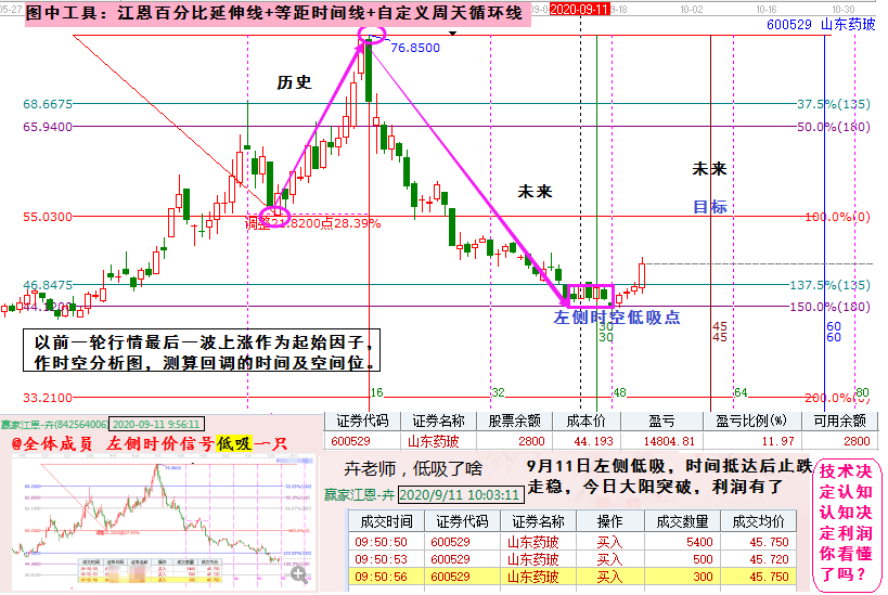 以前一輪行情最后一波上漲作為起始因子,運(yùn)用時(shí)空工具作分析圖,即可測算回調(diào)的時(shí)間及空間關(guān)鍵位。對照山東藥玻的圖形去看,自76.85下跌的30天在180度和135度支撐區(qū)間止跌震蕩,疊加倍數(shù)時(shí)間再次確認(rèn)轉(zhuǎn)勢信號后構(gòu)成日線低吸信號。按照規(guī)則,9月11日左側(cè)低吸,時(shí)間抵達(dá)后止跌走穩(wěn),今日大陽突破,近1.5萬的利潤到手。逢高減持放低成本,是為了更好的把握接下來的利潤,目標(biāo)在哪里,低吸高拋又如何做?繼續(xù)鎖定贏家消息吧!