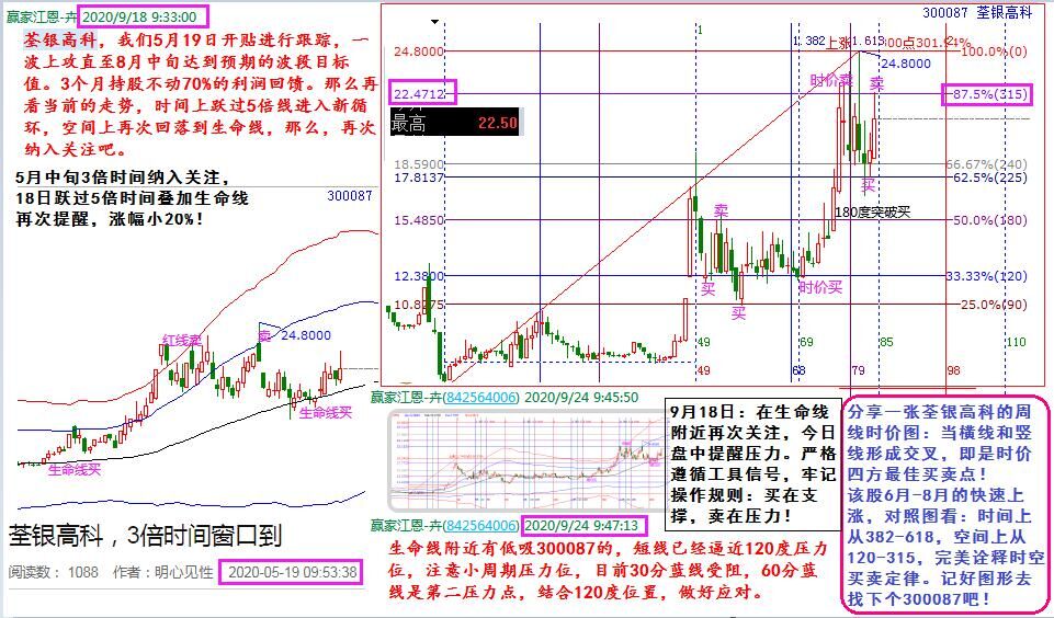 荃銀高科,5月19日躍過3倍時(shí)間納入關(guān)注,一波上漲給出70%的利潤;9月18日5倍時(shí)間再次回落到生命線構(gòu)成新的關(guān)注點(diǎn),連續(xù)幾日逆勢拉升,短線再次送出20%漲幅。今日盤中結(jié)合空間位置強(qiáng)調(diào)遇阻壓力位,做好應(yīng)對。實(shí)則,最高上沖到22.5(315度位置22.47)后,標(biāo)準(zhǔn)回落。時(shí)空的標(biāo)準(zhǔn)律動,你去找就會發(fā)現(xiàn)!該股日線圖形3個(gè)多月從未動過,一直持續(xù)更新,詳情可以點(diǎn)開下面鏈接學(xué)習(xí):http://liaoba.yjcf360.com/liaoba/300087/1369227.htm