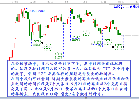 在圖中我們可以看到 近期大盤重要的高點(diǎn)和低點(diǎn)以及低點(diǎn)和低點(diǎn)之間的時(shí)間往往是7個(gè)交易日 9月21日的高點(diǎn)后7個(gè)交易日將會是下周二 也就是9月29日 能否在高點(diǎn)后的7個(gè)交易日出現(xiàn)新的轉(zhuǎn)折點(diǎn),我們拭目以待 感受7這個(gè)數(shù)字的神奇。