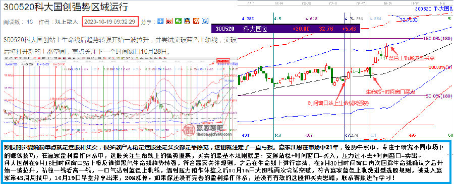 科大國創(chuàng)在9月18日時間窗口站上極反通道色生命線趨勢轉(zhuǎn)強,符合贏家關(guān)注規(guī)則,之后在生命線上進行震蕩,在9月30日時間窗口再次回踩生命線確認之后開始一波拉升,站穩(wěn)一線看高一線, 一口氣達到藍色上軌線,遇到壓力稍作休整之后10月16日大陽線再次嘗試突破,符合贏家藍色上軌激進型選股規(guī)則,被選入贏家第43周周報中,10月19日早盤分享出來,20%漲停。