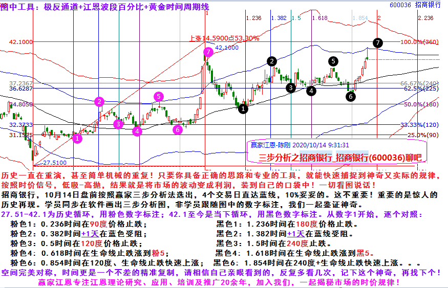 招商銀行,10月14日盤前按照贏家三步分析法選出,4個交易日直達藍線,10%妥妥的。這不重要!重要的是驚人的歷史再現(xiàn)。學(xué)員同步在軟件畫出三步分析圖,非學(xué)員跟隨圖中的數(shù)字標(biāo)注,我們一起鑒證神奇。