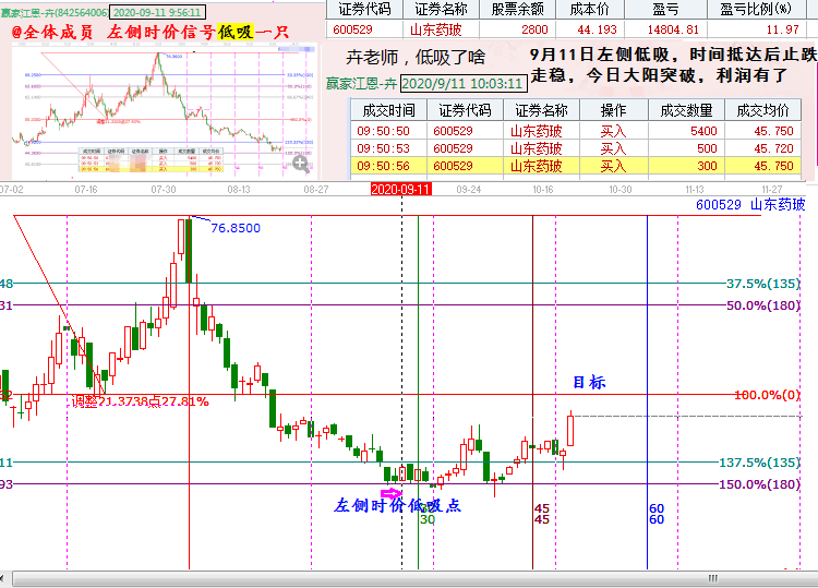 山東藥玻9月11日在群里公開發(fā)出分析圖,符合左側(cè)時價信號,同時毫不吝嗇的公開給敲門的朋友。后期該股在180度支撐止跌回升 給出2波盈利的機會。贏家江恩引領(lǐng)理性投資21年,每天盤中實盤大盤分析 個股解析和跟蹤 從一個個股選出-拉升-盈利目標(biāo),均是提前做好分析和計劃。