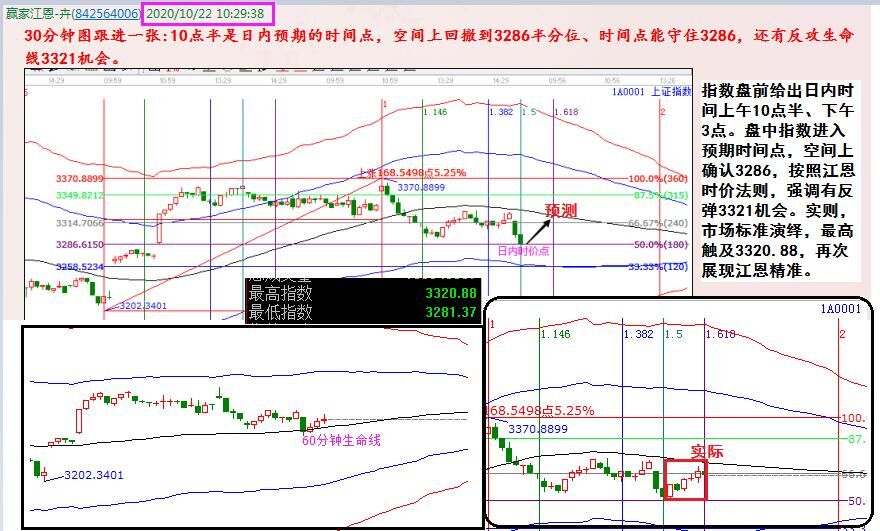 指數(shù)盤前給出日內(nèi)時間上午10點半、下午3點。盤中指數(shù)進入預(yù)期時間點,空間上確認3286,按照江恩時價法則,強調(diào)有反攻3321機會。實則,市場標(biāo)準(zhǔn)演繹,最高觸及3320.88,再次展現(xiàn)江恩精準(zhǔn)。學(xué)員可同步畫圖學(xué)習(xí)