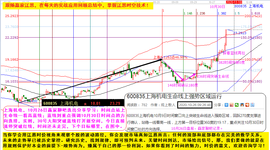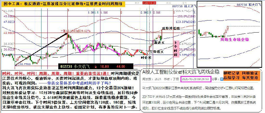 科大訊飛再次用實際走勢鑒證江恩時間周期的威力,12個交易日20%漲幅!對照圖形驗證學(xué)習(xí):10月28號盤前按照周線時間及生命線選出,且日線同步給出生命線關(guān)注信號,2.618時間突破藍色上軌線,踩著藍線穩(wěn)步震蕩,今日漲停沖擊紅線。下個時間3倍位置、上方空間依次看120度、180度,短線支撐0度價格線,波段支撐藍色上軌線??磮D定計劃,有準備的應(yīng)對下一步。