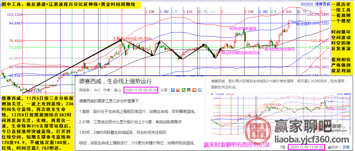 德賽西威,11月5日按三步分析規(guī)則加關(guān)注,一波上攻到藍(lán)線;236時(shí)間失守藍(lán)線,再次跌至生命線,12月8日按照規(guī)則結(jié)合382時(shí)間再度加關(guān)注,實(shí)則,再看這一波,生命線和315支撐帶站穩(wěn)后,今日直接漲停突破藍(lán)線,打開到紅線空間。短期支撐參考藍(lán)線和120度94.9,不破依次看180度、紅線,時(shí)間注意2.782附近。