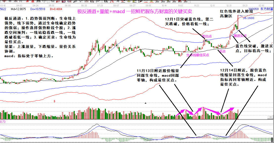 極反通道+量能+macd,一招鮮把握東方財(cái)富的關(guān)鍵買賣。