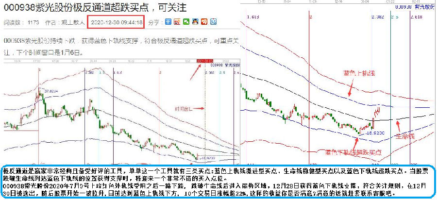 極反通道是贏家非常經(jīng)典且備受好評的工具,單單這一個(gè)工具就有三類買點(diǎn):藍(lán)色上軌線激進(jìn)型買點(diǎn)、生命線穩(wěn)健型買點(diǎn)以及藍(lán)色下軌線超跌買點(diǎn)。當(dāng)股票跌破生命線到達(dá)藍(lán)色下軌線的位置獲得支撐時(shí),將迎來一個(gè)非常不錯(cuò)的買入點(diǎn)位。