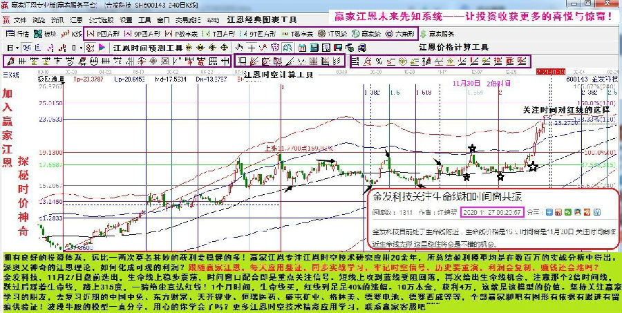 金發(fā)科技,11月27日盤前選出,生命線上穩(wěn)步震蕩,時(shí)間窗口配合即是重點(diǎn)關(guān)注信號(hào)。短線上攻到藍(lán)線受阻回落,再次給出生命線機(jī)會(huì),注意那個(gè)2倍時(shí)間線,躍過后踩著生命線,踏上315度,一騎絕塵直達(dá)紅線!1個(gè)月時(shí)間,生命線買,紅線到足足40%的漲幅。10萬本金,獲利4萬,這就是該模型的價(jià)值。堅(jiān)持關(guān)注贏家學(xué)習(xí)的朋友,去復(fù)習(xí)近期的中國中免、東方財(cái)富、天齊鋰業(yè)、恒瑞醫(yī)藥、盛屯礦業(yè)、格林美、德賽電池、德賽西威等等,全部贏家聊吧有圖形有依據(jù)有跟進(jìn)有留痕供驗(yàn)證!波段牛股的模型一直分享,用心的你學(xué)會(huì)了嗎?更多江恩時(shí)空技術(shù)精彩應(yīng)用學(xué)習(xí),聯(lián)系贏家客服吧~~~