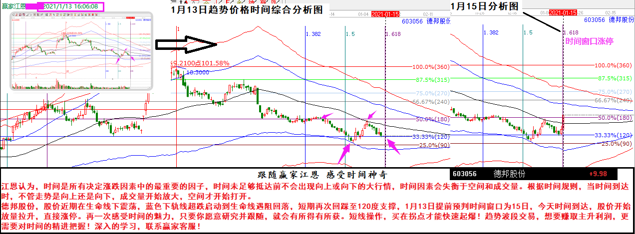 德邦股份,股價(jià)近期在生命線下震蕩,藍(lán)色下軌線超跌啟動(dòng)到生命線遇阻回落,短期再次回踩至120度支撐,1月13日提前預(yù)判時(shí)間窗口為15日,今天時(shí)間到達(dá),股價(jià)開始放量拉升,直接漲停。再一次感受時(shí)間的魅力,只要你愿意研究并跟隨,就會(huì)有所得有所獲。短線操作,買在拐點(diǎn)才能快速起爆!趨勢波段交易,想要賺取主升利潤,更需要對時(shí)間的精進(jìn)把握!深入的學(xué)習(xí),聯(lián)系贏家客服!