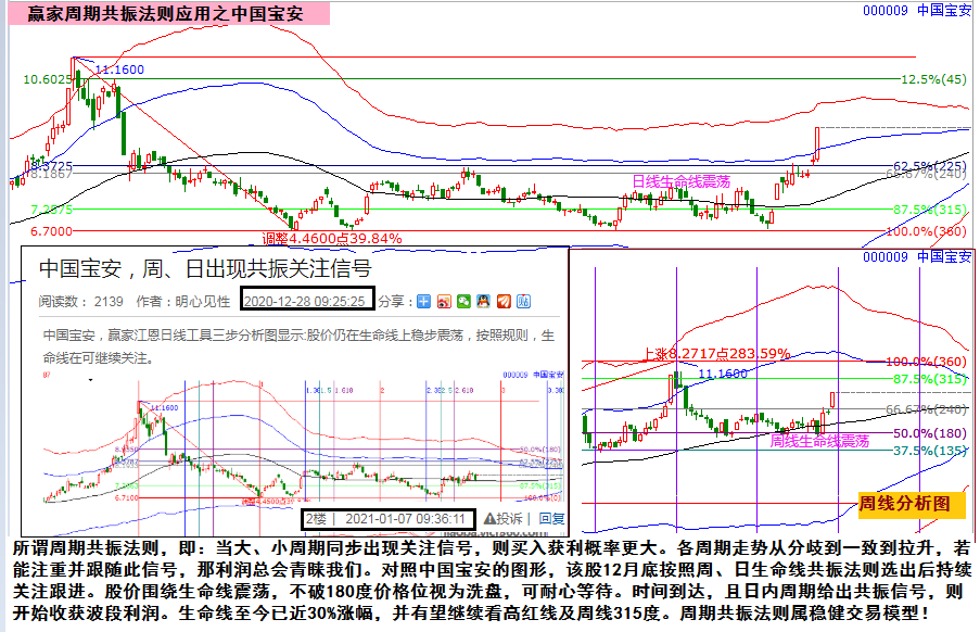 贏家周期共振法則應(yīng)用之中國寶安所謂周期共振法則,即:當(dāng)大、小周期同步出現(xiàn)關(guān)注信號,則買入獲利概率更大。各周期走勢從分歧到一致到拉升,若能注重并跟隨此信號,那利潤總會青睞我們。對照中國寶安的圖形,該股12月底按照周、日生命線共振法則選出后持續(xù)關(guān)注跟進(jìn)。股價圍繞生命線震蕩,不破180度價格位視為洗盤,可耐心等待。時間到達(dá),且日內(nèi)周期給出共振信號,則開始收獲波段利潤。生命線至今已近30%漲幅,并有望繼續(xù)看高紅線及周線315度。周期共振法則屬穩(wěn)健交易模型!
