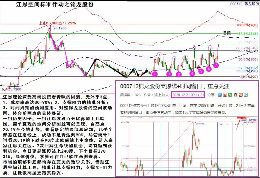 <江恩時間窗+生命線>選股應(yīng)用之洛陽鉬業(yè)生命線是強(qiáng)勢股票的啟動點,買股買在生命線,穩(wěn)健又強(qiáng)勢;時間是決定市場走勢的關(guān)鍵因子。當(dāng)江恩時間窗遇到生命線,視為極佳進(jìn)場信號。對照洛陽牧業(yè)分析圖,先看粉色1-2-3,江恩時間窗口加生命線給出進(jìn)場信號后,均如期展開一波上攻;再看黑色1、2,上攻到紅線遇阻后疊加時間窗展開快速回調(diào)。粉1到黑1,一波上漲;粉2到黑2,一波上漲;粉3呢?繼續(xù)踩著生命線展開上攻,逼近第一目標(biāo)藍(lán)線,問:黑3在哪呢?洛陽鉬業(yè)12月15日按照時價法則選出、2月1日提前選出,2月8日強(qiáng)調(diào)時間窗抵達(dá)生命線,連續(xù)4日上攻今日封板,漲幅達(dá)25%!