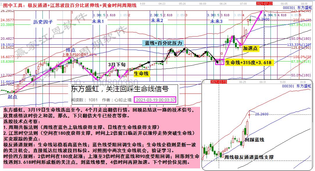 東方盛虹,3月19日生命線選出至今走出翻倍行情。回顧總結這一路的技術信號,欣賞感悟這時價之和諧,那么,下只翻倍大牛已經在等你。(贏家江恩學員,每日同步畫圖學習)