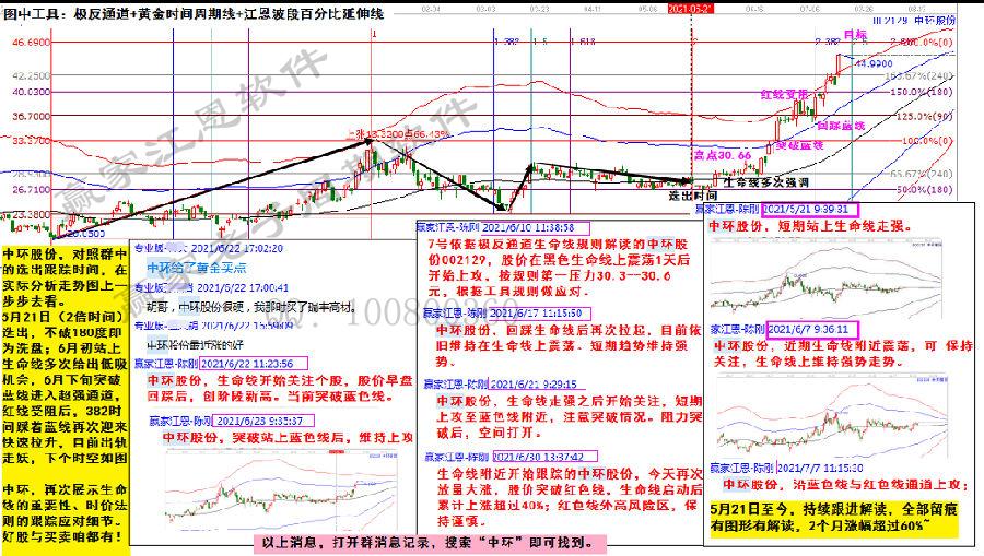 中環(huán)股份,對照群中的選出跟蹤時間,在實際分析走勢圖上一步步去看。5月21日(2倍時間)選出,不破180度即為洗盤;6月初站上生命線多次給出低吸機會,6月下旬突破藍線進入超強通道,紅線受阻后,382時間踩著藍線再次迎來快速拉升,目前出軌走妖,下個時空如圖!
