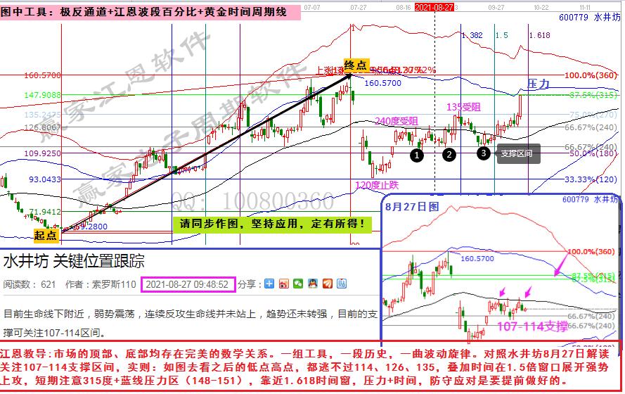 江恩教導(dǎo):市場(chǎng)的頂部、底部均存在完美的數(shù)學(xué)關(guān)系。一組工具,一段歷史,一曲波動(dòng)旋律。對(duì)照水井坊8月27日解讀關(guān)注107-114支撐區(qū)間,實(shí)則:如圖去看之后的低點(diǎn)高點(diǎn),都逃不過(guò)114、126、135,疊加時(shí)間在1.5倍窗口展開(kāi)強(qiáng)勢(shì)上攻,短期注意315度+藍(lán)線壓力區(qū)(148-151),靠近1.618時(shí)間窗,壓力+時(shí)間,防守應(yīng)對(duì)是要提前做好的。