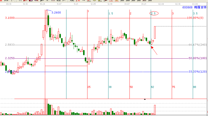 ?:價格分析:江恩價格百分比:每一條線都起到一個壓力支撐的作用,1月25日600868此票處于江恩價格百分比的240度強支撐位置,和極反生命線形成共振。
