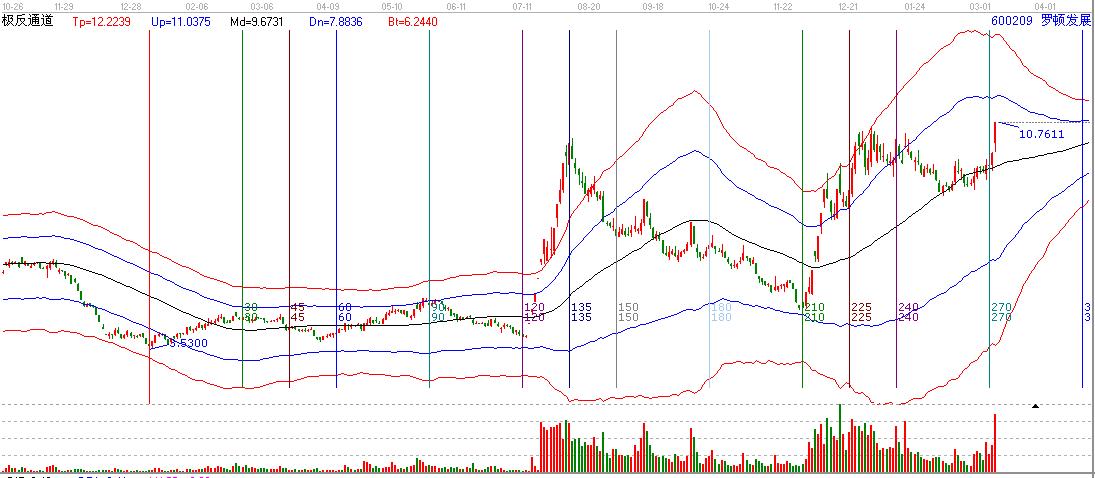 我們以600209羅頓發(fā)展2012年3月30日為起點做自定義周天江恩時間循環(huán)工具圖,可看出羅頓發(fā)展(600209)60度位置12.04.11日啟動,漲到了極反通道上軌位置90度時間,波段30周天漲幅收益29.3%。在90度位置到120度時間的下跌跌了30%多,跌倒120度位置然后就開始了一波120度到135度的瘋狂拉升,短期漲幅170%更為神奇的是羅頓發(fā)展在135度位置展開了一波長期下跌一直殺跌到極反通道跟時間210度位置,再一次演繹了神奇的拉升。240度位置2013-01-15再一次殺跌,然后在極反通道生命線跟其270度位置2013-03-05日再一次拉升漲停