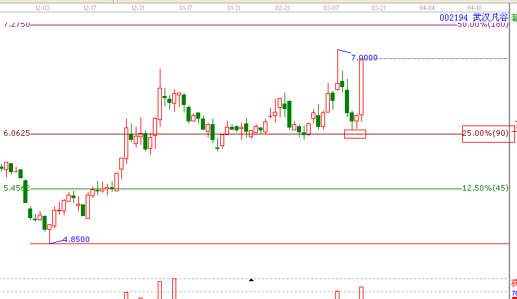 *:江恩價(jià)格百分比:依據(jù)江恩價(jià)格百分比規(guī)則,(線(xiàn)上支撐,線(xiàn)下阻力,站穩(wěn)一線(xiàn),看高一線(xiàn) )002194,,13年2月27日低點(diǎn)處于江恩價(jià)格百分比的90度的支撐位置,(90度價(jià)格6.06元)