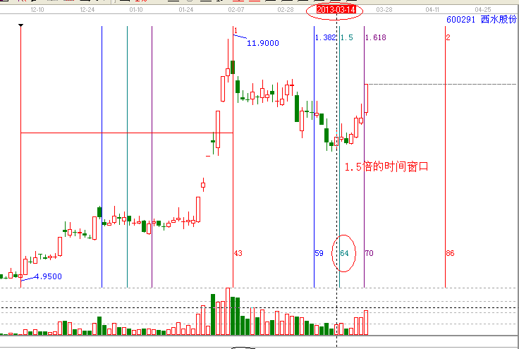 *:黃金時(shí)間周期線:依據(jù)贏家黃金時(shí)間周期線提示600291,3月14日低點(diǎn)為黃金時(shí)間周期的1.5倍的時(shí)間窗口,和江恩價(jià)格百分比的50%的位置形成四方,{使用方法:選擇一個(gè)完整的波段的高低點(diǎn),600291選擇低點(diǎn)12.4日低點(diǎn)——高點(diǎn)13年2月6日)【黃金時(shí)間延伸線是黃金分割理論和江恩等距離時(shí)間循環(huán)理論的完美結(jié)合。這個(gè)工具就是將一個(gè)完整的波段八分,這個(gè)工具主要是運(yùn)用黃金分割來預(yù)測指數(shù)和股價(jià)的變化時(shí)間的。起到一個(gè)變盤時(shí)間點(diǎn)的作用】