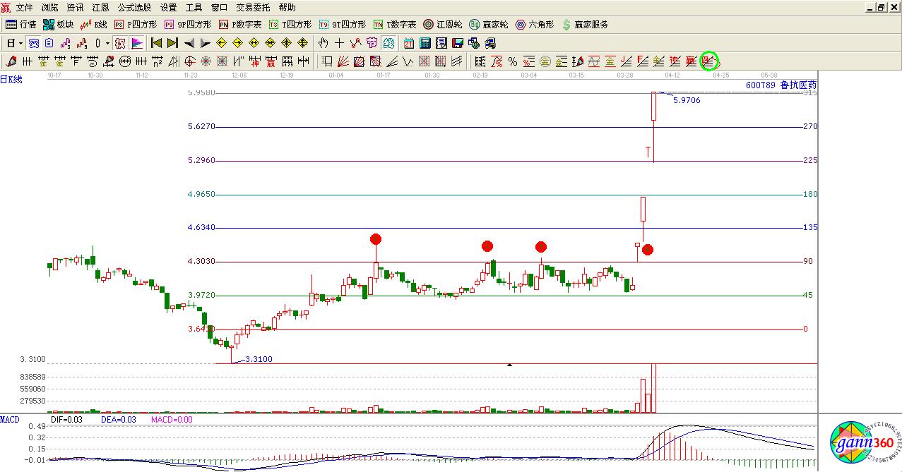 600789在2012-12-04日低點(diǎn)3.31位置上行至2013-01-15最高位置4.48位置這里4.30是其K線價格四方形90度位置壓力位置,然后展開了第一次回調(diào)調(diào)整至45度位置再一次上行在2013-02-22日第2次挑戰(zhàn)90度位置再一次遇阻回落明顯的45度位置強(qiáng)支撐最低位置都沒有碰到這里3.97位置在2013-03-06日第3次挑戰(zhàn)90度位置依然沒有結(jié)果。最為重要的是其2013-04-01日再其消息的刺激下(H7N9)禽流感??焖偻黄?0度位置封死漲停。成功的完成了一個4次的突破,消息技術(shù)的結(jié)合無疑是最佳的介入點(diǎn)。之后伴隨著消息的持續(xù)性,連續(xù)4個交易日拉出4個漲停。實(shí)現(xiàn)了一次質(zhì)的改變。這就是消息跟江恩4次的完美配合。所以下一次遇到江恩4次的股票,一定要注意了哦。特別是消息配合的股票。