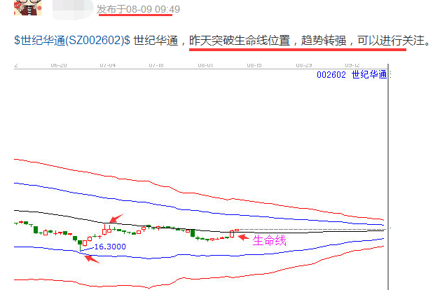 2.在極反通道操作規(guī)則中,生命線將個股分為強勢和弱勢兩個區(qū)域,當個股處于極反通道生命線上,則為強勢,當個股處于極反通道生命線下,則個股處于弱勢區(qū)域。強勢區(qū)域個股操作機會多,股性活躍,盈利空間大。而生命線下個股則走勢偏弱,股性也慢,操作風險偏大。因為極反通道就是一個個股能否操作的判斷性工具。也因為簡單直觀,所以能幫使用者更快速的判斷市場,判斷個股,并得出結(jié)論。極反通道的五條線均可以是個股的阻力位支撐位,站穩(wěn)為支撐,破位為阻力。按照江恩的講解,買在支撐位,賣在阻力位,因此,當個股突破站穩(wěn)生命線的時候,趨勢剛剛轉(zhuǎn)變,可以看作新的行情的啟動點,生命線就是最佳的買點位置,所以在8月9日個股再次突破并回踩生命線的時候,就形成了新的機會,開始操作。