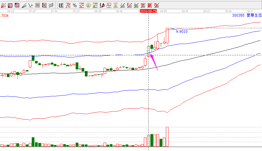 江恩技術(shù)分析:300355在8月29日開始關(guān)注,通過極反通道、趨勢(shì)線,以及黃金時(shí)間周期線的分析,再加上成交量的配合,在短線和波段上都是有很大的潛力的,因此開始操作。