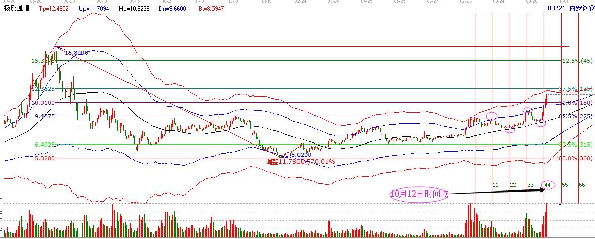 對(duì)于西安飲食,我們并不陌生,關(guān)注本站的朋友可以瀏覽前期的文章,我們?cè)?jīng)總結(jié)過(guò)一次該股的獲利操作。具體是:9月1日時(shí)間點(diǎn)股價(jià)藍(lán)色線回落生命線附近,提示分批低吸,此后市場(chǎng)上漲,在一個(gè)周期內(nèi),從生命線直接拉升到了極反通道藍(lán)色線的位置,這一波有將近25%的盈利空間。而此后市場(chǎng)在9月20日時(shí)間點(diǎn)見(jiàn)高點(diǎn)回落,并逐步破位藍(lán)色線及當(dāng)時(shí)的225度重要支撐線,此后一直回落到生命線附近才止跌,因此,按照工具提示,市場(chǎng)再次進(jìn)入可操作區(qū)域,這也就是近期的二次買(mǎi)入獲利,下面我們?cè)敿?xì)看。