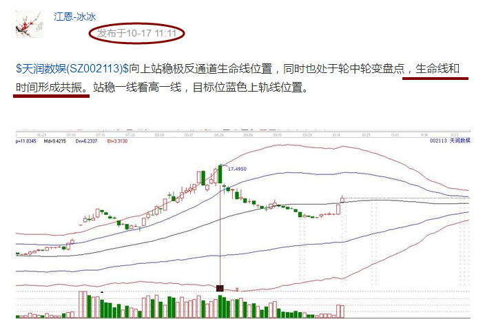 江恩分析圖形:依據(jù)贏家江恩極反通道操作規(guī)則,當(dāng)個(gè)股處于極反通道生命線上,則個(gè)股處于可操作區(qū)域,當(dāng)個(gè)股處于生命線下,則暫時(shí)放棄。通常情況下,當(dāng)個(gè)股向上突破極反通道生命線位置,則生命線附近就是最佳的買點(diǎn)位置。天潤(rùn)數(shù)娛在10月17日向上突破極反通道生命線位置,突破生命線開(kāi)啟新的一輪行情,因此我們?cè)?7日選出該股。