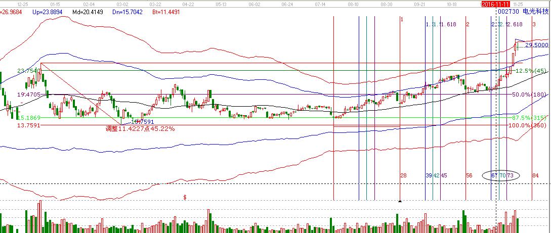 2.工具解析:首先看趨勢(shì)工具,該股近期處于生命線上與藍(lán)色線之間震蕩上行,趨勢(shì)上保持強(qiáng)勢(shì),因此,按照極反通道的操作規(guī)則,生命線附近即可參與,按照“一線站穩(wěn),看高一線;一線破位,看低一線?!钡牟僮饕?guī)則即可。然后看價(jià)格,波段百分比是最簡(jiǎn)單的江恩式價(jià)格分析工具,其原理是江恩理論三分八分原理,而其中最重要的一個(gè)分割位就是50%,也就是180度分割,市場(chǎng)在11月11日前后處于180度支撐附近,此位置是生命線支撐與價(jià)格支撐的共振位,所以是非常好的一個(gè)參與點(diǎn)位。最后,時(shí)間上,通過時(shí)間工具可以清晰的看到11月14日是時(shí)間窗口,所以,時(shí)間點(diǎn)前一天11月11日,根據(jù)工具分析,提醒買入機(jī)會(huì)。