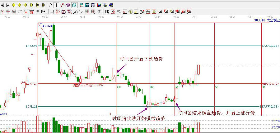 按照上面的理論依據(jù),以及時間和價格的意義,我們做出上圖,時間的意義一目了然。再結(jié)合上價格波動,8月1號為時間窗,即將發(fā)生趨勢反轉(zhuǎn),而價格上也在百分比137.5%價格支撐位,時間窗+價格支撐=買點。因此。8月以來的上漲是預(yù)期之內(nèi)的表現(xiàn)。