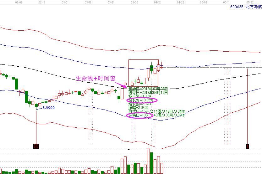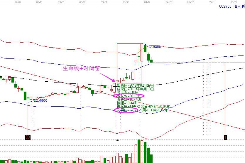 生命線和時(shí)間窗共振的位置啟動(dòng),上藍(lán)色上軌線位置,再到紅色上軌線位置,之后從紅色上軌線開始回落,走出一波完整的上漲波段。3月27日至4月10日高點(diǎn),共9個(gè)交易日,漲幅空間近40%,生命線+時(shí)間窗盈利模型完美驗(yàn)證。