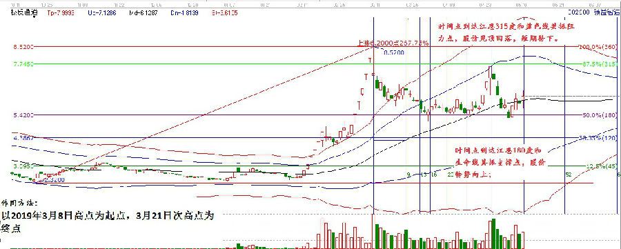 筆者將兩組時(shí)間圖形融合在一起,可以看到關(guān)鍵的啟動(dòng)點(diǎn)2019年2月20日突破趨勢(shì)向上,開(kāi)啟快速拉升行情;5月9日為兩組時(shí)間工具的共振時(shí)間點(diǎn),股價(jià)從生命線拉起漲停,開(kāi)啟新一輪的上漲。具體不再細(xì)說(shuō)。