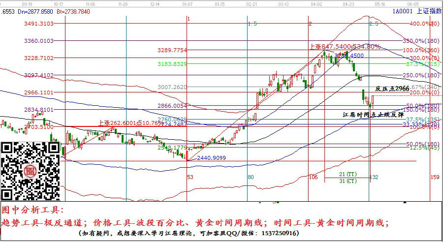 調(diào)整階段,選取的是兩個(gè)臨近的高點(diǎn),從圖中可以看到4月16日時(shí)間窗口股價(jià)回探到生命線和江恩180度支撐,形成共振,市場(chǎng)轉(zhuǎn)勢(shì)向上;4月25日時(shí)間窗口股價(jià)上攻到極反通道藍(lán)色線和江恩315度阻力點(diǎn),形成共振,股價(jià)見(jiàn)頂回落,短期下行。