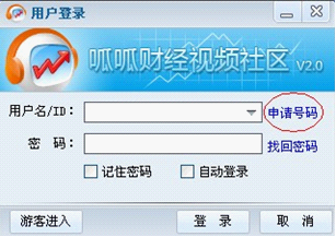 第三步:安裝好后桌面出現(xiàn)"呱呱財(cái)經(jīng)視頻社區(qū)",雙擊,點(diǎn)擊申請?zhí)柎a。申請?zhí)柎a,像QQ一樣,號(hào)碼申請完畢后記住號(hào)碼,然后登陸大廳