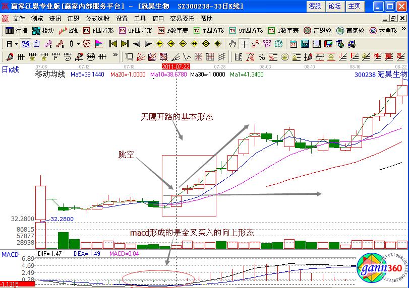 在股市中想要買入或者賣出任何一只股票,都需要經(jīng)過一些形態(tài)的研究和分析,接下來我們講解的第一則實(shí)例冠昊生物(300238)在2011年7月25日的走勢變化,從圖中可以發(fā)現(xiàn),在股價(jià)低位出現(xiàn)陰線十字星形態(tài)之后,股價(jià)前期的趨勢發(fā)生轉(zhuǎn)變,之后出現(xiàn)了光頭光腳的漲停板形態(tài),在第二個(gè)交易日的時(shí)候出現(xiàn)向上的跳空形態(tài),并出現(xiàn)了放量的走勢形態(tài),說明形成的是螺旋槳K線形態(tài),將兩者的形態(tài)相結(jié)合,形成的就是“天鷹開路”形態(tài),在該跳空沒有回補(bǔ)的形態(tài)處,投資者可以進(jìn)行積極的介入操作,等待后市的上漲行情。